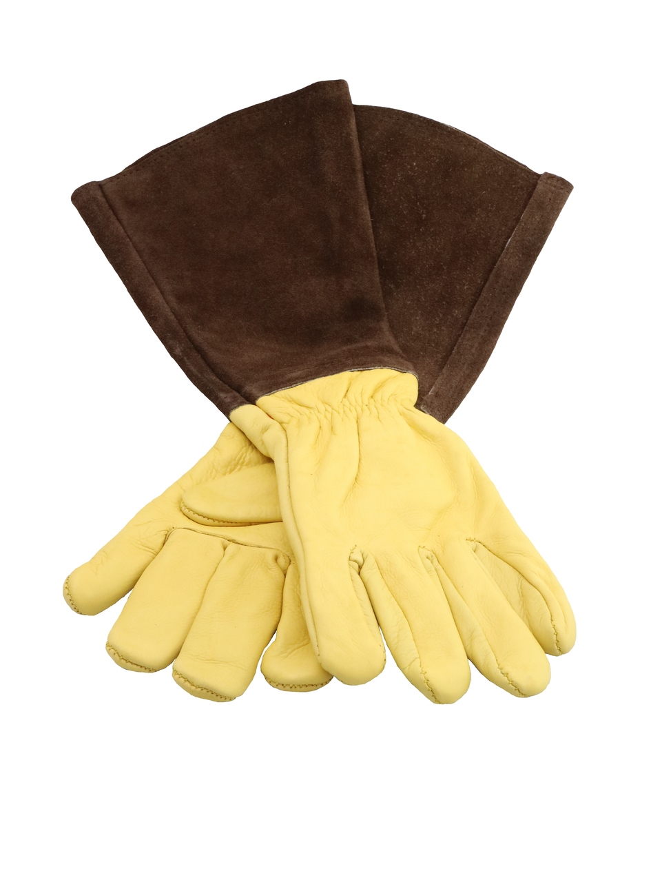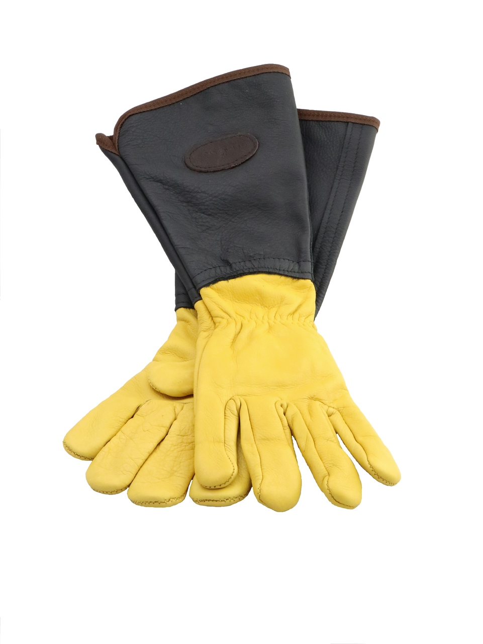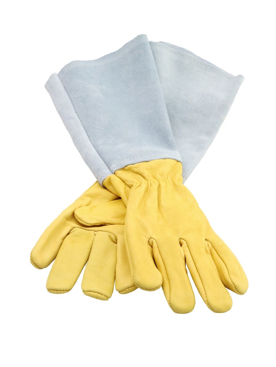 Weiches Leder schützt die Hände und lange Stulpen aus extra dickem Leder schützen die Arme.Das Leder für die Hände ist bei den kleinen Handschuhen/Small weiß - bei den großen/Large ist das Leder gelb.