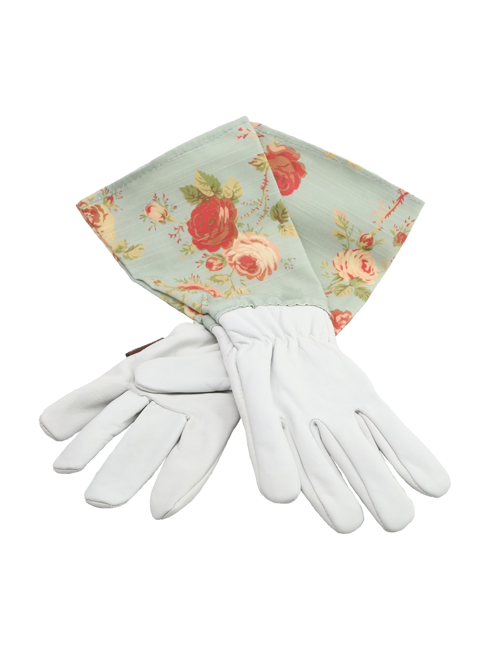 Weiches, wasserabweisendes Leder schützt die Hände und lange Stulpen aus englischem Rosenleinen schützen die Arme.