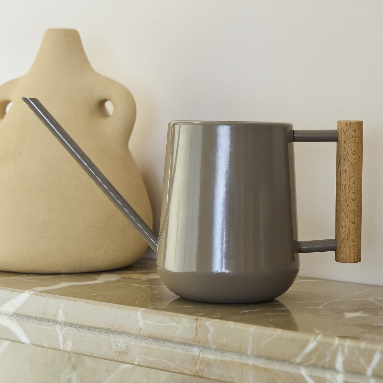 Zimmergießkanne in trendiger Form und modernen Farben - genau richtig, um Ihre Zimmerpflanzen glücklich und gesund zu halten.Die Gießkanne ist perfekt ausbalanciert und mit einer eleganten, schlanken Tülle ausgestattet, was es einfacher macht, das Wasser direkt an die Erde - nahe an die Pflanze zu bringen - zielgenau dorthin, wo es benötigt wird. Der auffällig gewellte Griff passt zu dem neuen Trend in der Innenausstattung, die sich zunehmend einer weicheren Ästhetik zuwendet - mit geschwungenen Formen und fließenden Linien.