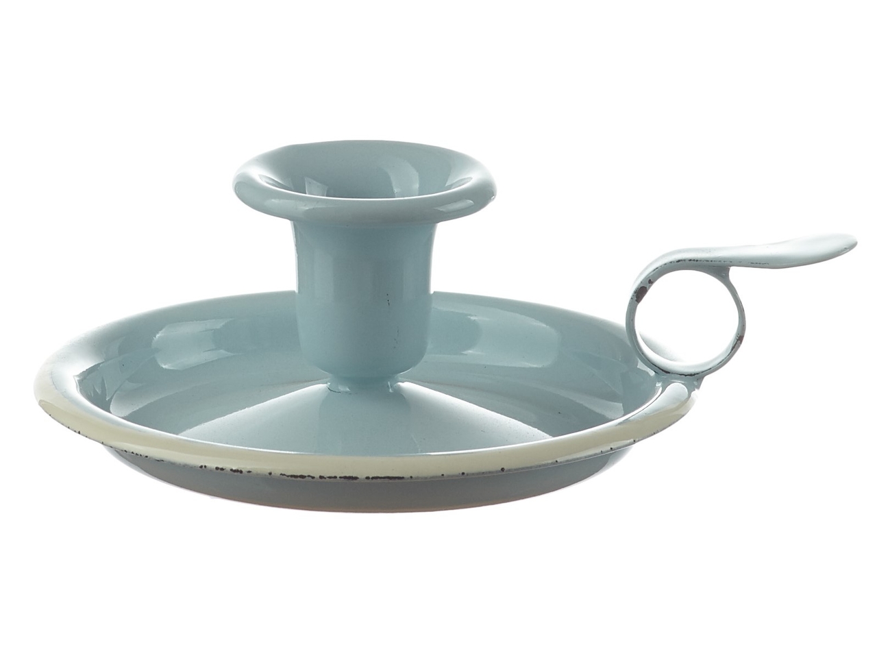 Pastellfarbener Emaille-Kerzenhalter mit cremefarbenem RandZeitlos schön in Pastell | mintgrün, blau oder rosa - zaubert im Handumdrehen ein 'So wie früher' zu der liebevoll gestalteten Deko-Ecke, auf den Tee- oder Kaffeetisch.
