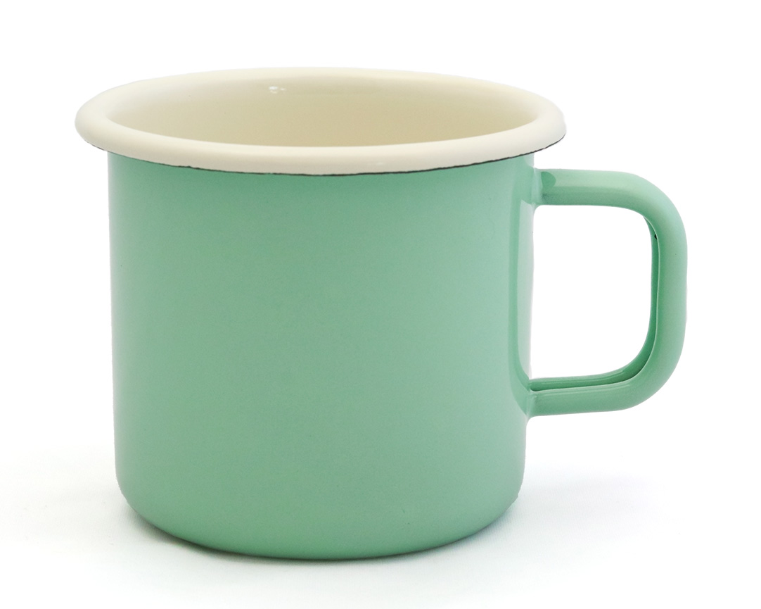 Wie herausgefallen aus der 'Guten alten Zeit' kommt die pastellfarbene Emailletasse daher.