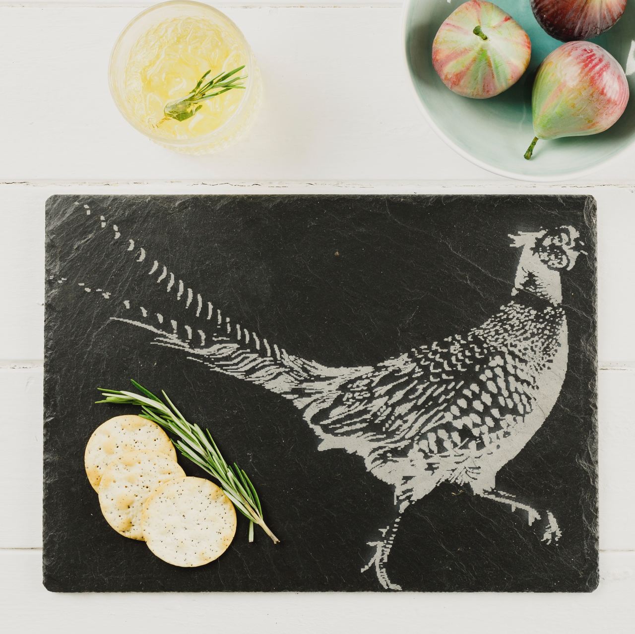 Der Fasan: Handillustriert und -graviert auf schlichten Platztafeln | in Schottland von Hand aus hochwertigem Schiefer geschnitten