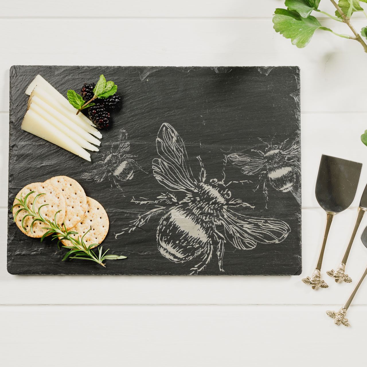 Stilvolles Serviertablett mit eingraviertem Motiv Honigbiene - handillustriert und -graviert in Schottland