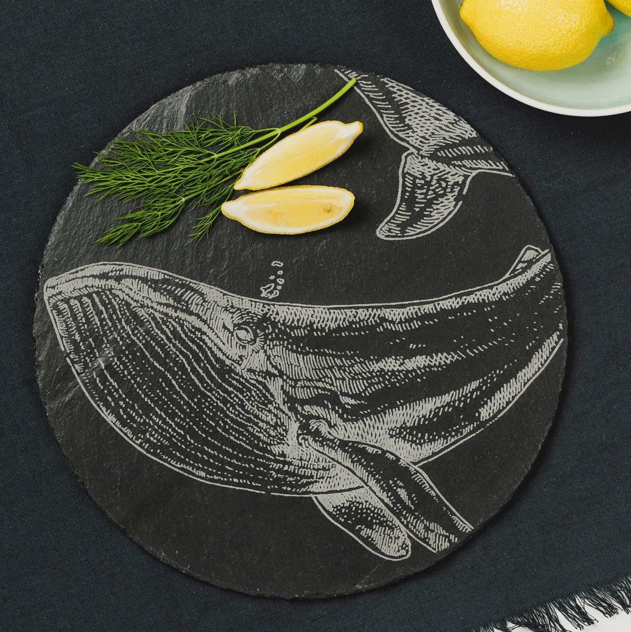 Runde Käseplatte mit einem Wal, der gelassen seine Runde schwimmt. Eine schöne, handgezeichnete Illustration auf hochwertigem Schiefer - in Schottland von Hand geschnitten und graviert.