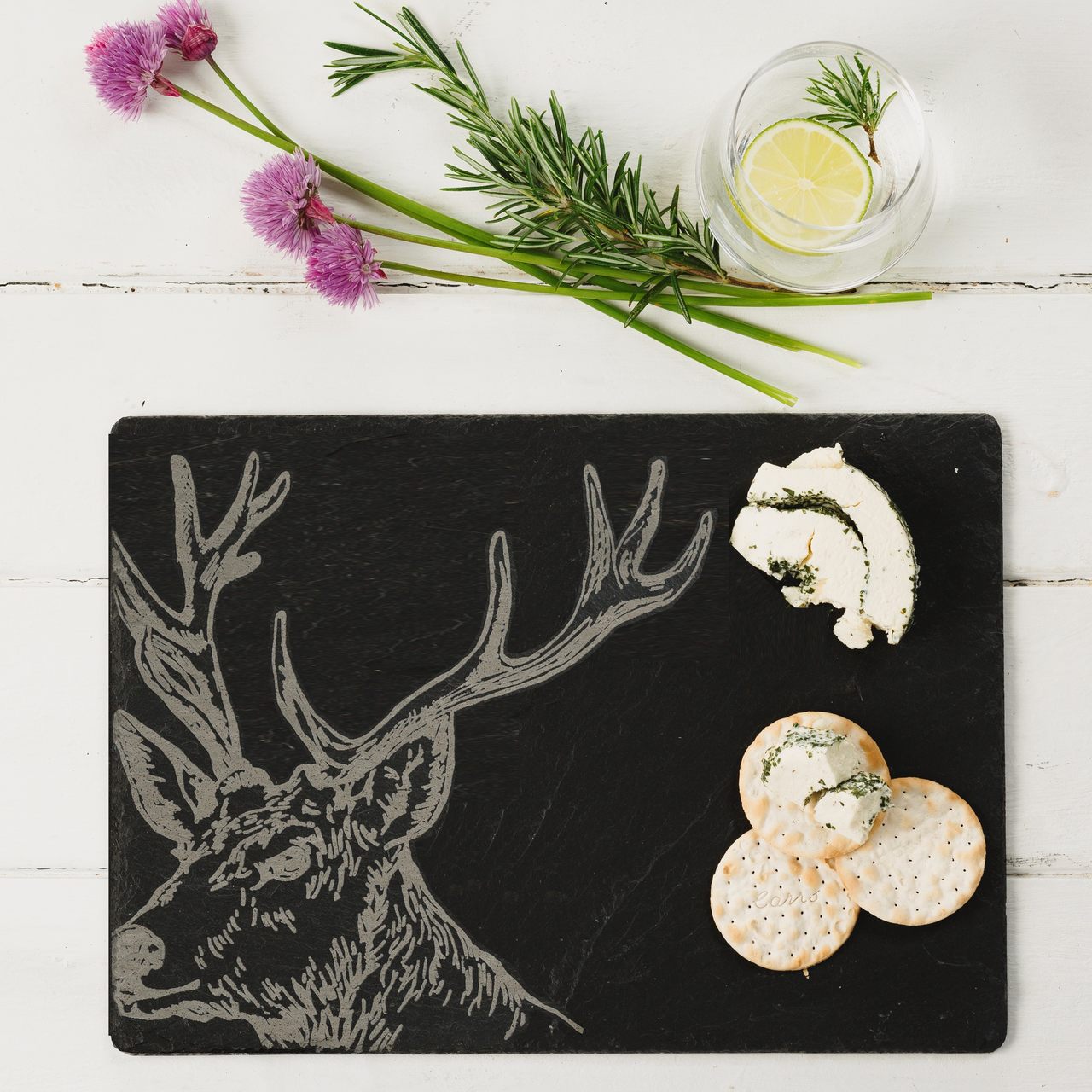 Edle Schiefer-Käseplatten mit eingravierten Country-Motiven aus Schottlands Wäldern, Feldern oder Landleben | trendig, stylisch oder originell handillustriert und -graviert in Schottland - ebenso praktisch wie dekorativ.