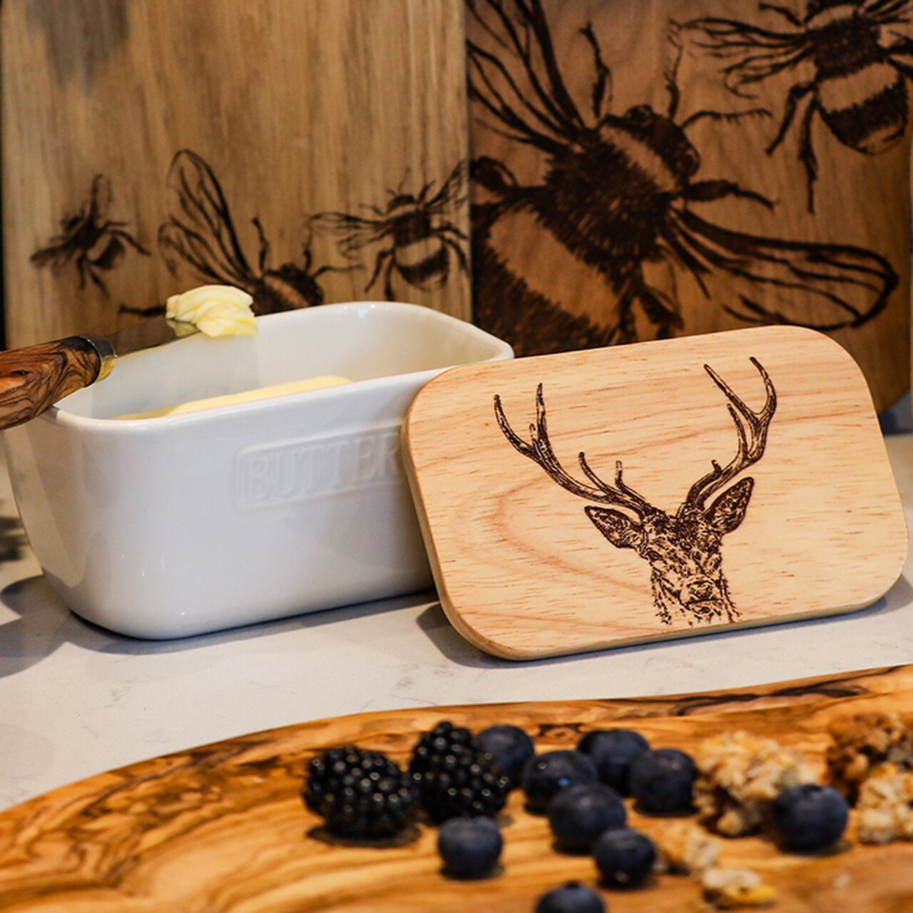 Trendige Butterdose mit Hirsch-Motiv | aus Keramik und Eiche | gemütlicher Landhaus-Chic für Küche und Tisch