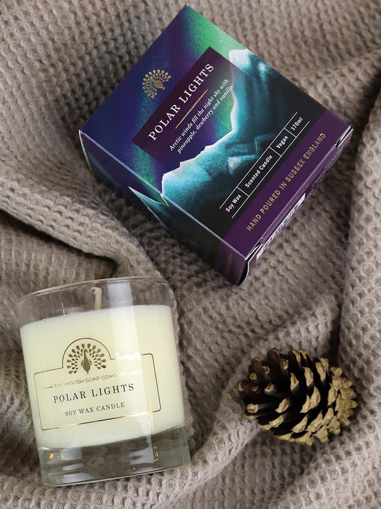 Der belebende Duft der Polarlichter-Kerze verbreitet sich im Raum wie das Glühen des Nordlichthimmels und erzeugt ein warmes und einladendes Ambiente von Gemütlichkeit und Wohlbefinden.